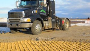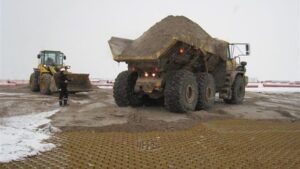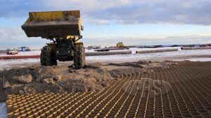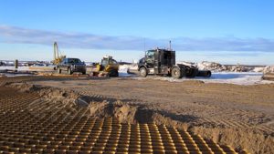The high tensile stiffness and strength of the Neoloy enhanced the engineering value of reclaimed sand under heavy loading soil. Neoloy Tough-Cell performs well even over fully saturated conditions. In addition Neoloy’s very low coefficient of thermal expansion (CTE) – particularly when compared to HDPE Soft-Cells – provides long-term dimensional stability even under the subarctic freeze-thaw cycles.